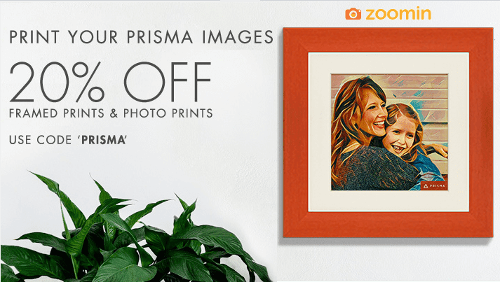 Zoomin app is offering flat 20% off on your Prisma app photo prints & framed prints. + Also get 20% Cashback (Upto Rs.75) via FreeCharge wallet if you pay via FreeCharge. Grab this offer now!