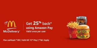McDelivery – Get Flat 25% Cashback Upto Rs 100 via Amazon...